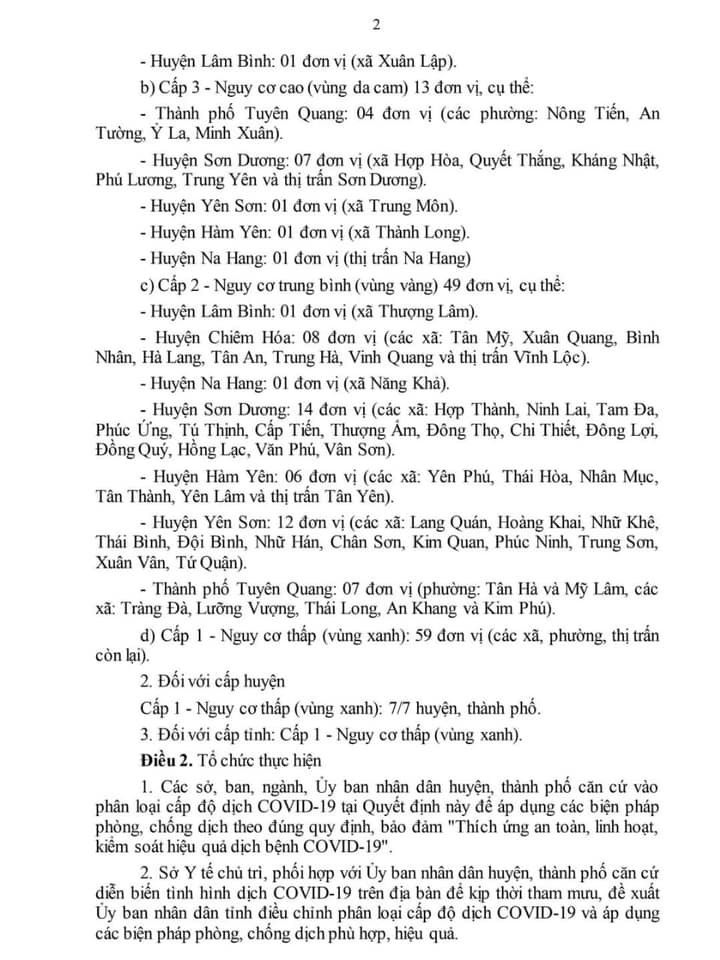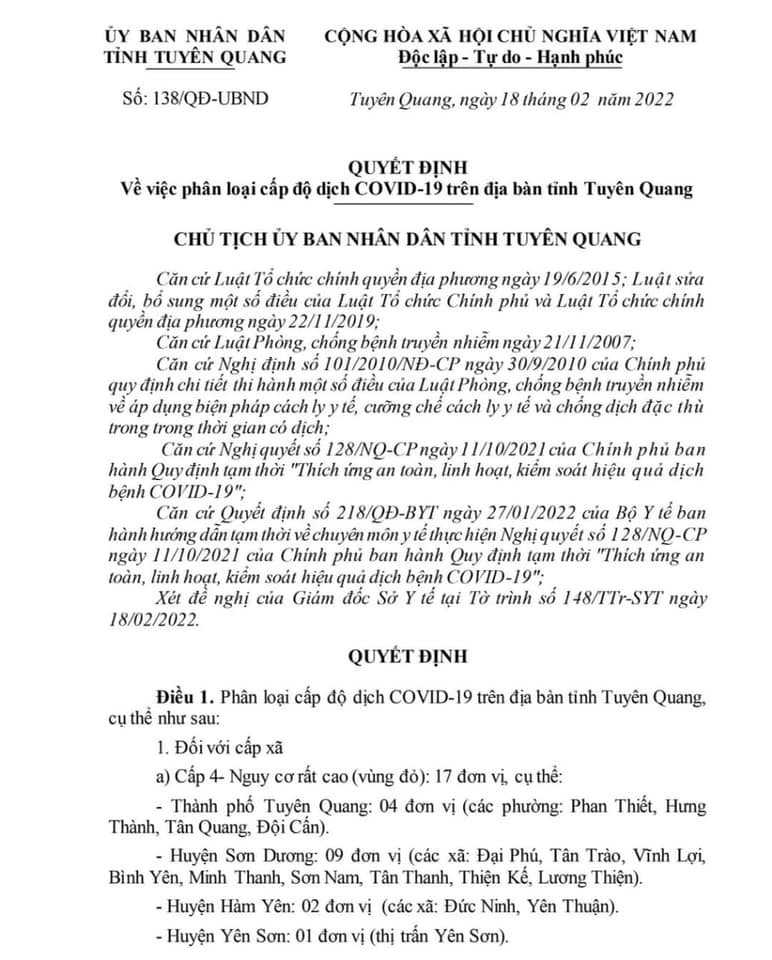 Phân loại cấp độ dịch Covid-19 trên địa bàn tỉnh Tuyên Quang