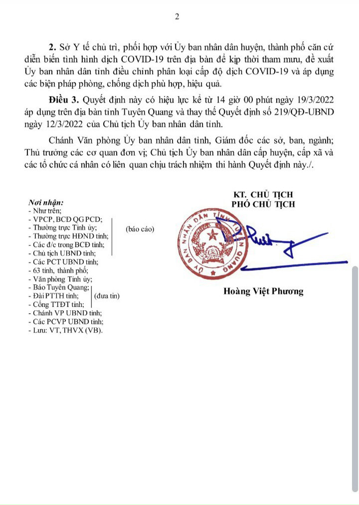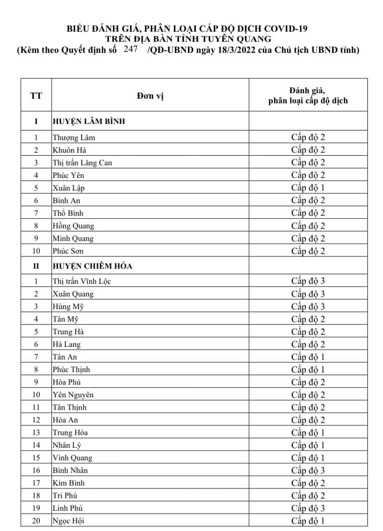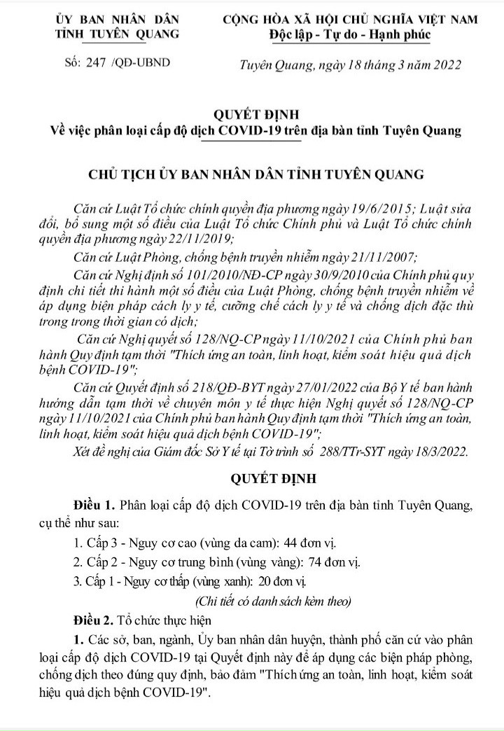 UBND tỉnh đã ban hành Quyết định số 247/QĐ-UBND về việc phân loại cấp độ dịch Covid-19 trên địa bàn tỉnh Tuyên Quang như sau: