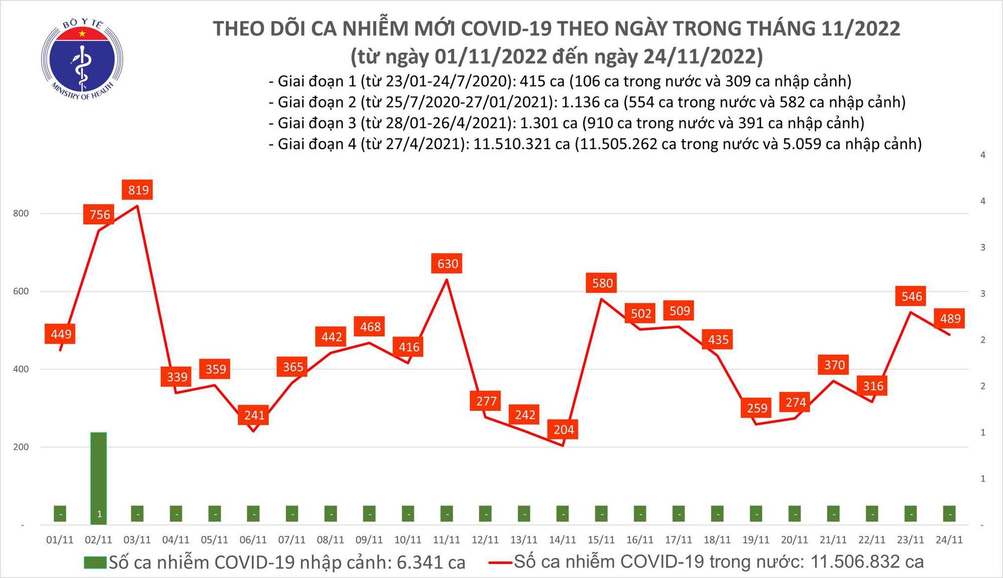 YTTQ: Bản tin phòng chống dịch COVID-19 ngày 24/11 của Bộ Y tế cho biết có 489 ca mắc mới; hôm nay ghi nhận 1 trường hợp tử vong; trong ngày tiêm hơn 100.000 liều vaccine COVID-19