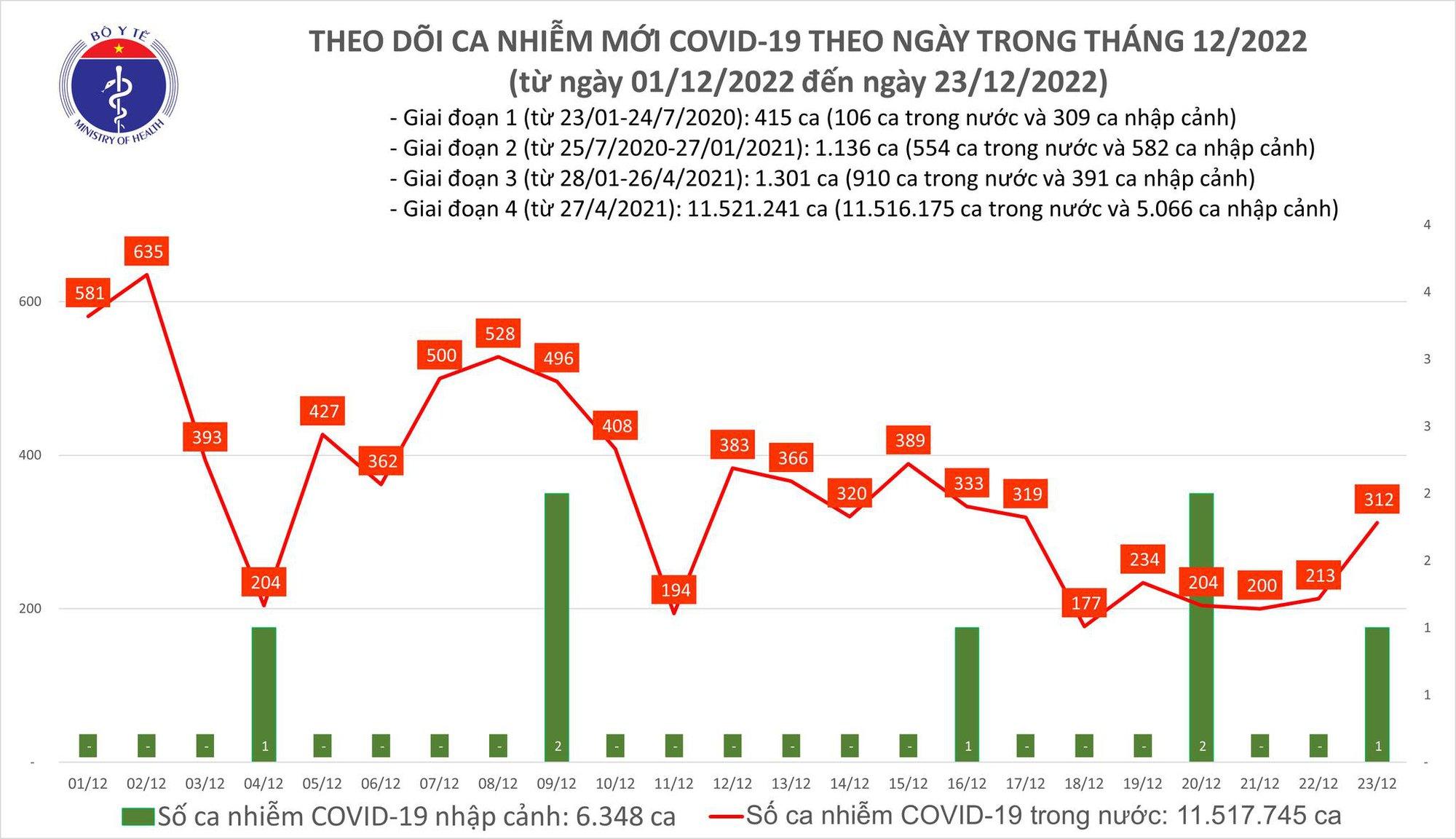 YTTQ: Bản tin phòng chống dịch COVID-19 ngày 23/12 của Bộ Y tế cho biết, có 312 ca mắc COVID-19, tăng thêm 100 ca so với ngày trước đó; trong ngày ghi nhận 2 bệnh nhân COVID-19 tử vong.