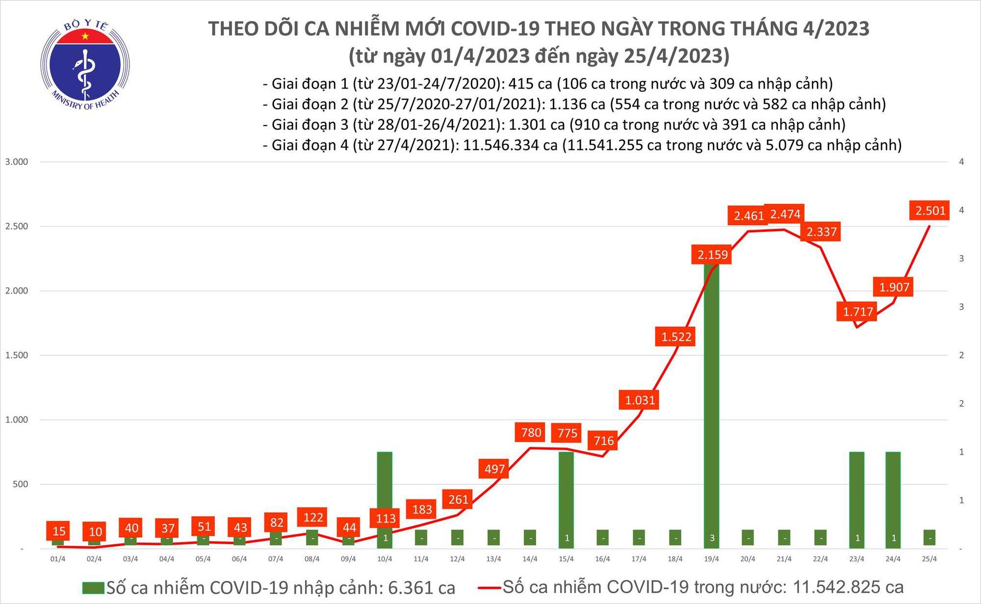 YTTQ: Bản tin phòng chống dịch COVID-19 ngày 25/4 của Bộ Y tế cho biết, có 2.501 ca mắc, cao nhất trong hơn nửa năm qua. Hôm nay ghi nhận 1 bệnh nhân COVID-19 tại Nam Định tử vong. Bệnh nhân thở oxy cũng tăng lên 145 ca.