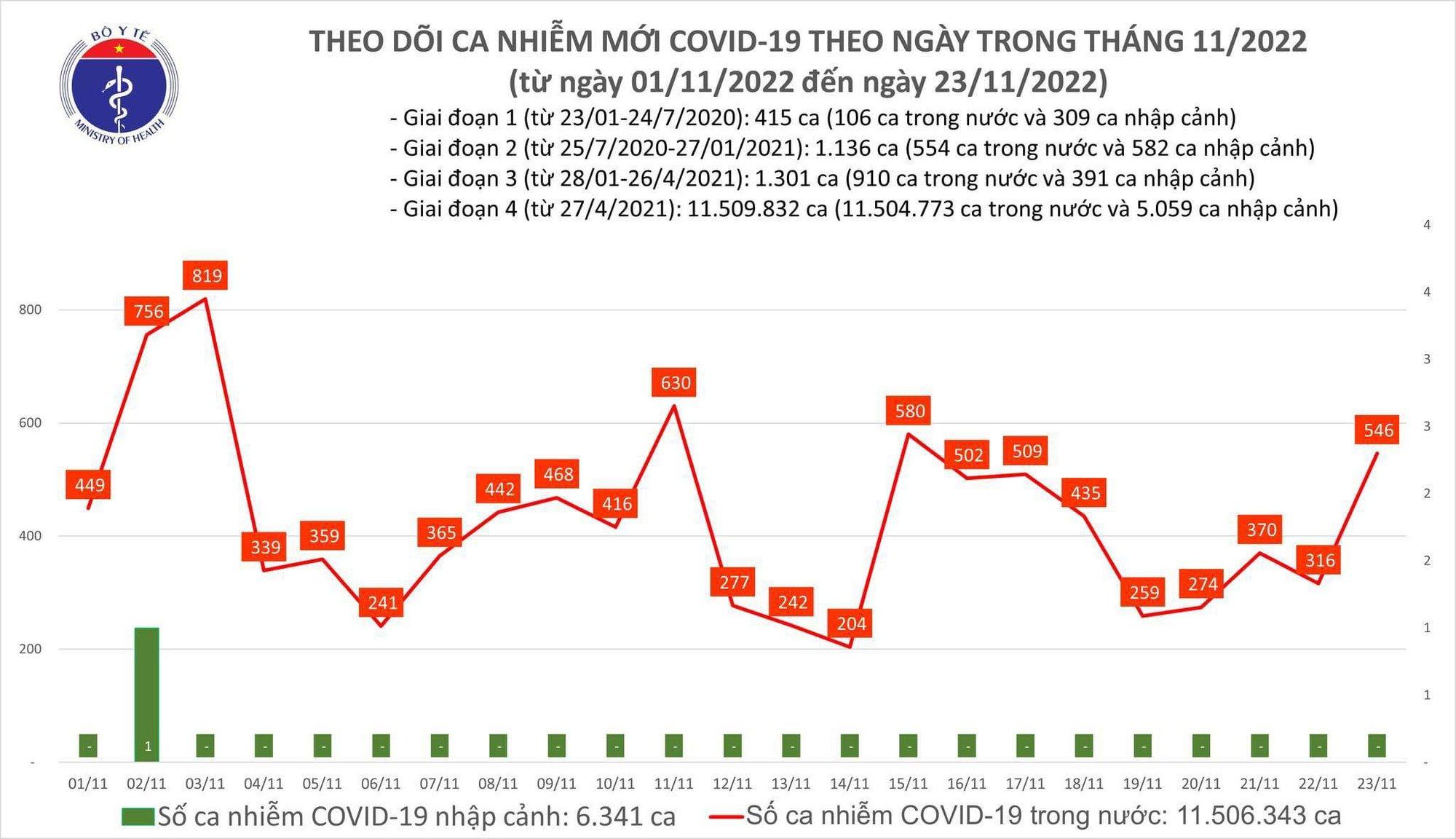YTTQ: Bản tin phòng chống dịch COVID-19 của Bộ Y tế ngày 23/11 cho biết, có 546 ca mắc COVID-19, tăng hơn 200 ca so với hôm qua; trong ngày tiếp tục không ghi nhận bệnh nhân tử vong.