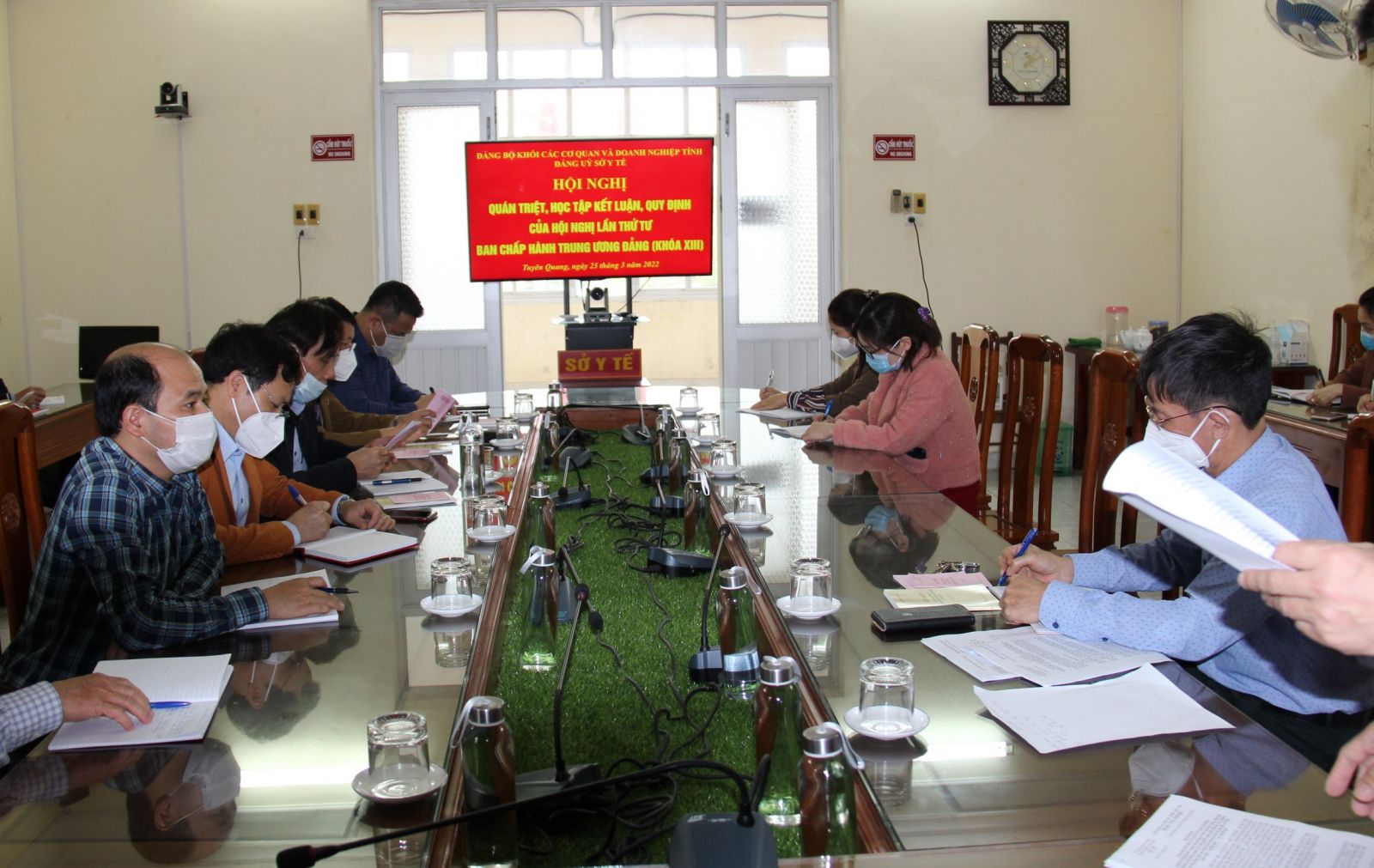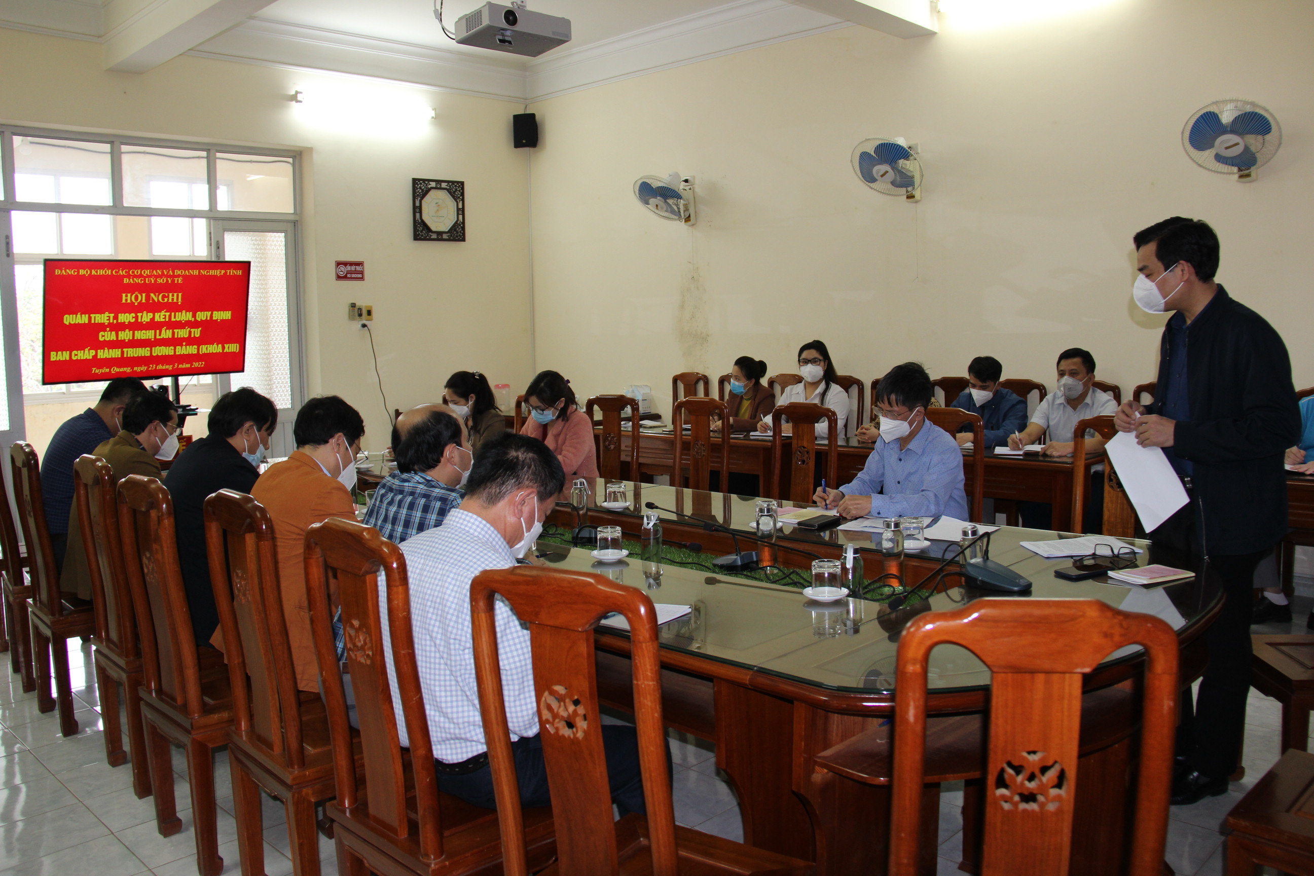 Thực hiện Kế hoạch số 48-Kh/ĐUK ngày 11/3/2022 của Ban Thường vụ Đảng ủy Khối các cơ quan và doanh nghiệp tỉnh. Chiều ngày 23/03, Đảng ủy Sở Y tế đã tổ chức Hội nghị quán triệt, học tập kết luận, Quy định của Hội nghị lần thứ tư Ban Chấp hành Trung ương Đảng (khóa XIII); tổ chức đợt sinh hoạt chính trị về xây dựng, chỉnh đốn Đảng và hệ thống chính trị tới các đồng chí cán bộ, đảng viên, người lao động các chi bộ trực thuộc Đảng bộ Sở Y tế.