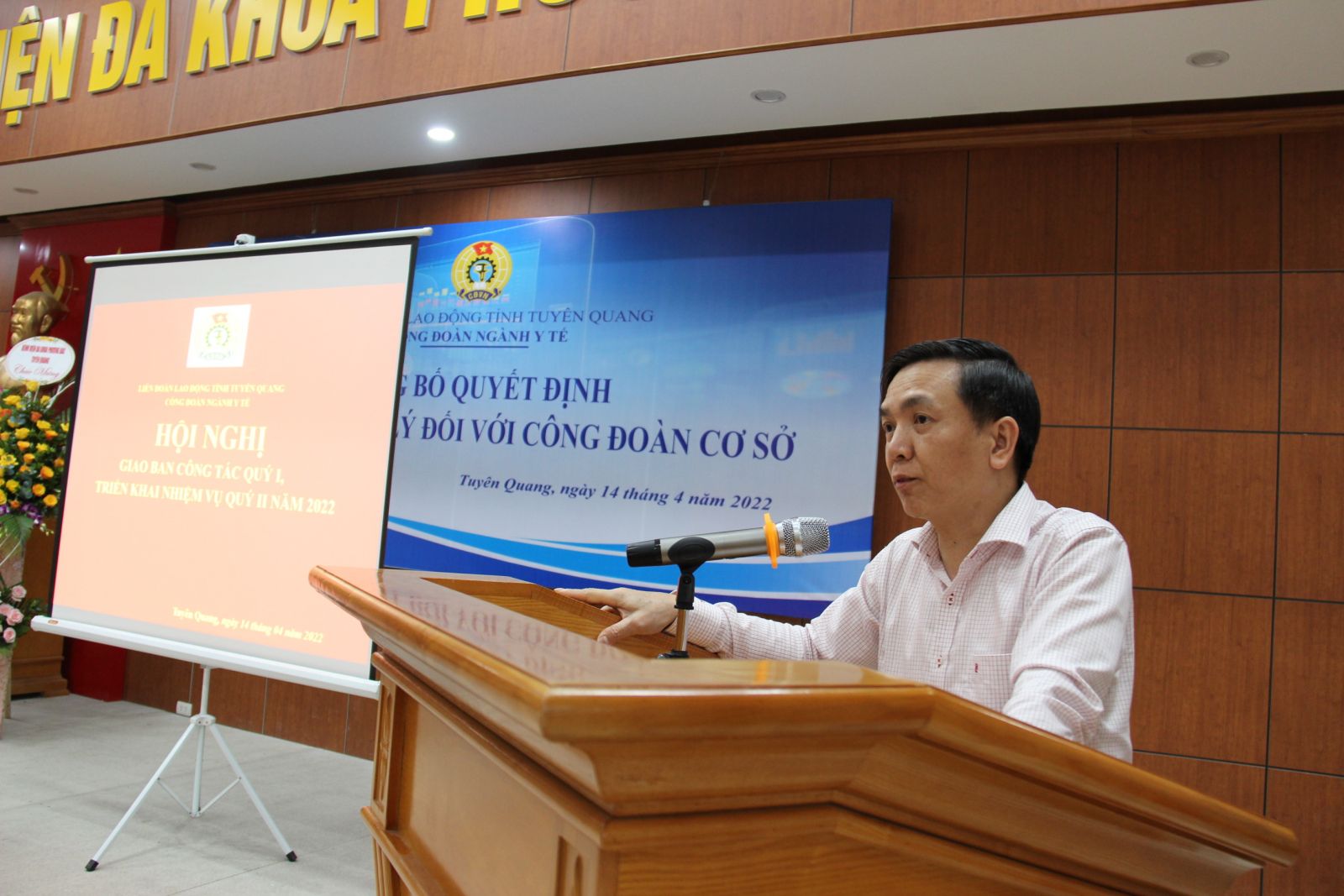 Báo cáo tại hội nghị đồng chí Nguyễn Thế Yên – Phó Giám đốc Sở Y tế, Chủ tịch Công đoàn ngành Y tế đã nêu bật kết quả hoạt động công đoàn và phong trào CBCCVCLĐ trong quý I, phương hướng nhiệm vụ công tác công đoàn trong quý II/2022 của công đoàn ngành. Theo đó, trong quý I/2022, các cấp công đoàn đã phát huy tốt vai trò đại diện chăm lo và bảo vệ quyền lợi hợp pháp, chính đáng của người lao động, tuyên truyền, vận động người lao động học tập, nâng cao trình độ, kỹ năng nghề nghiệp, chấp hành pháp luật tốt chủ trương của Đảng, chính sách pháp luật của Nhà nước. Nổi bật là các hoạt động thăm hỏi, tặng quà cho đoàn viên công đoàn, người lao động có hoàn cảnh đặc biệt khó khăn, bệnh hiểm nghèo…trong dịp Tết Nguyên đán 2022. Phát động thi đua cao điểm chào mừng kỷ niệm 92 năm Ngày thành lập Đảng Cộng Sản Việt Nam (3/2/1930 – 3/2/2022); các hoạt động chào mừng kỷ niệm 112 năm Ngày Quốc tế Phụ nữ, 1982 năm khởi nghĩa Hai Bà Trưng và “Tuần lễ áo dài”.…được các công đoàn cơ sở tổ chức sôi nổi, đi đôi với việc phòng, chống dịch COVID-19 trong trạng thái bình thường mới.