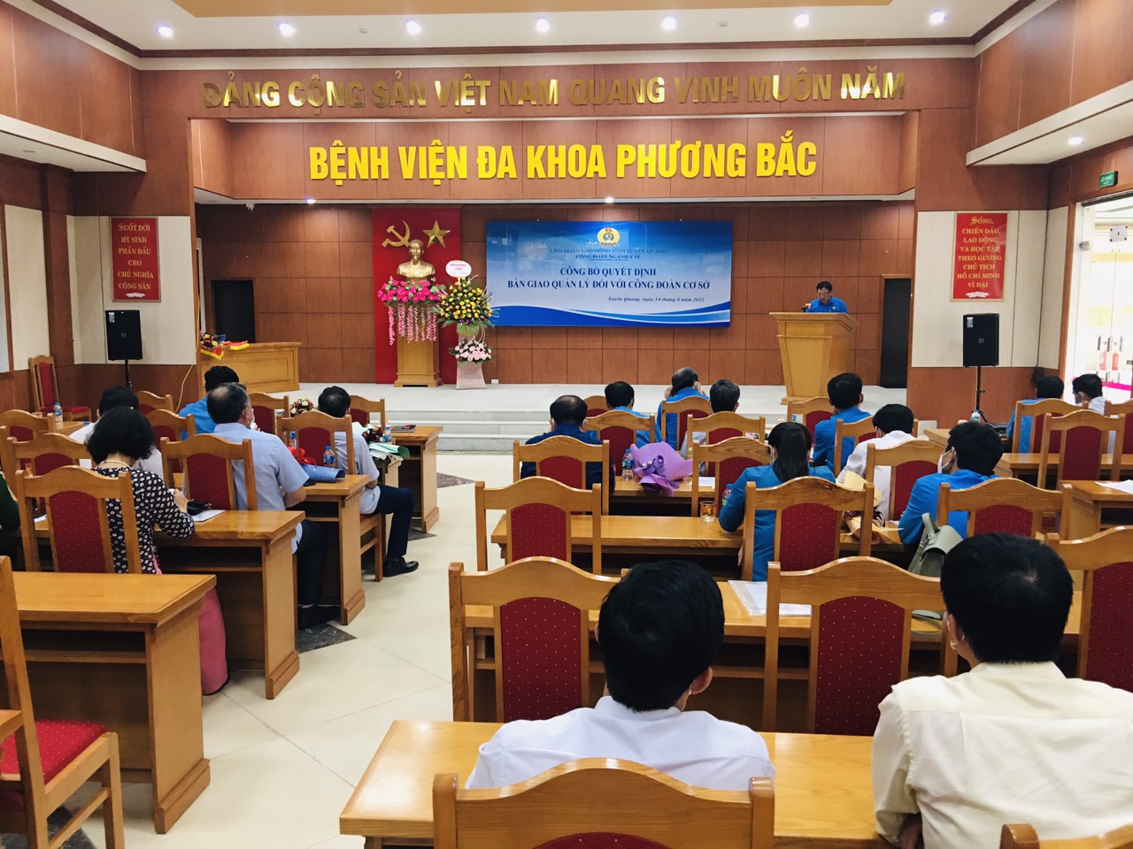 Chiều 14/4, tại Hội trường Bệnh viện Đa khoa Phương Bắc, Công đoàn ngành Y tế đã tổ chức Lễ bàn giao tiếp nhận 06 công đoàn cơ sở Trung tâm Y tế tuyến huyện và 03 CĐCS Bệnh viện đa khoa khu vực về trực thuộc Công đoàn ngành Y tế tỉnh Tuyên Quang quản lý bao gồm: Công đoàn cơ sở Trung tâm Y tế huyện Na Hang, Yên Sơn, Sơn Dương, Hàm Yên, Chiêm Hóa, Lâm Bình; Công đoàn cơ sở Bệnh viện Đa khoa khu vực ATK, huyện Yên Sơn; CĐCS Bệnh viện Đa khoa khu vực Yên Hoa, huyện Na Hang, CĐCS Bệnh viện Đa khoa khu vực Kim Xuyên, huyện Sơn Dương. Dự Lễ bàn giao có đồng chí Đỗ Văn Ngọc – Phó Chủ tịch Thường trực LĐLĐ tỉnh, đồng chí Nguyễn Thành Hưng - Bí thư Đảng Ủy, Giám đốc Sở Y tế, đồng chí Nguyễn Thế Yên- Phó Giám đốc Sở Y tế, Chủ tịch Công đoàn ngành Y tế, đến dự còn có Giám đốc các đơn vị trực thuộc ngành Y tế, các đồng chí Ủy viên Ban thường vụ công đoàn ngành Y tế và Chủ tịch các công đoàn cơ sở trực thuộc ngành Y tế.