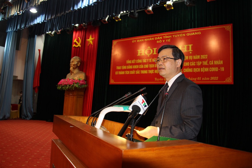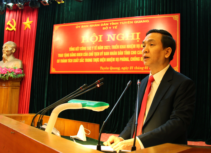 Phát biểu chỉ đạo Hội nghị, đồng chí Nguyễn Văn Sơn, Chủ tịch Uỷ ban nhân dân tỉnh ghi nhận và đánh giá cao những đóng góp của cán bộ, công chức, viên chức ngành y tế đã góp sức mình trong công tác phòng chống dịch trong năm 2021. Đồng chí nhấn mạnh: năm 2021 là một năm chồng chất khó khăn, tuy nhiên đứng trước khó khăn đó, ngành y tế nói riêng và tỉnh nói chung đã có những bước chuyển hướng phù hợp với những chiến lược, biện pháp để phòng, chống dịch Covid-19 đạt hiệu quả cao. Cùng với đó năng lực, kinh nghiệm về phòng chống dịch của ngành y tế cũng phát huy được hiệu quả thiết thực và chia sẻ với các tỉnh bạn trong công tác phòng chống dịch. Tuy nhiên, do dồn toàn lực vào công tác phòng chống dịch Covid-19 nên các chỉ tiêu về khám chữa bệnh, một số đề án, chương trình vẫn còn chậm so với tiến độ đề ra. Đồng chí đề nghị năm 2022, ngành y tế ngoài nhiệm vụ then chốt là phòng chống dịch Covid-19 sẽ tiếp tục sắp xếp hoàn thiện trong định hướng phát triển hệ thống mạng lưới, phân cấp tự chủ về nhân lực, tháo gỡ những khó khăn và triển khai thi viên chức ngành y tế. Đồng thời nỗ lực cao nhất nâng cao chất lượng khám chữa bệnh, đẩy mạnh ứng dụng công nghệ thông tin và chuyển đổi số, triển khai đề án khám chữa bệnh từ xa…nâng cao chất lượng khám, điều trị bệnh nhân trên địa bàn tỉnh.