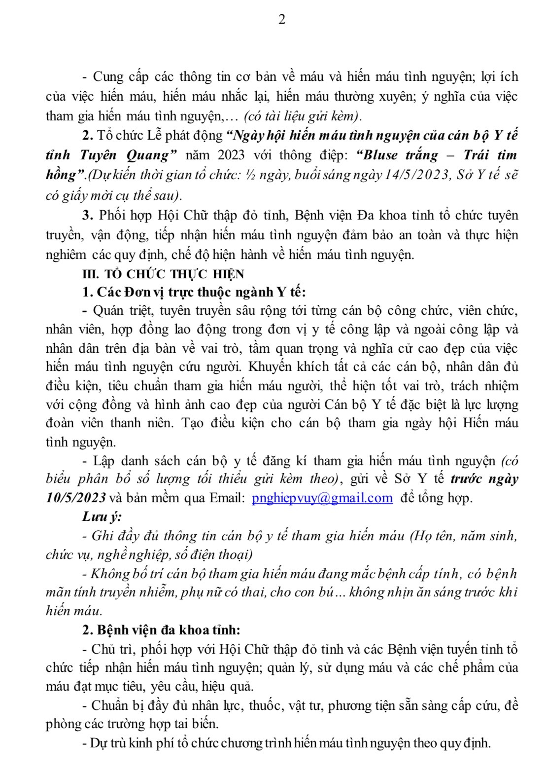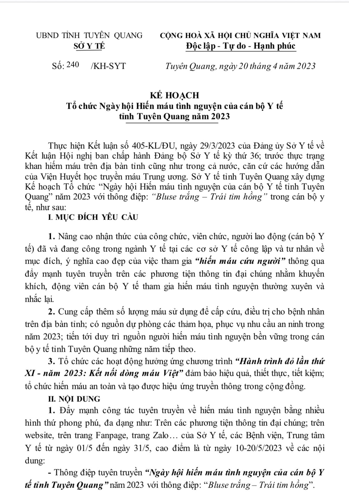 Ngày 20/04/2023, Sở Y tế tỉnh đã ban hành Kế hoạch 240/KH-SYT Chiến dịch tuyên truyền, vận động và tổ chức hiến máu tình nguyện trong ngành y tế năm 2023 (Dự kiến thười gian tổ chức: ½ ngày, buổi sáng ngày 14/5/2023).