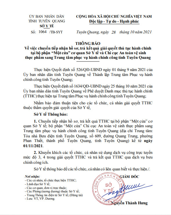 Ngày 28 tháng 10 năm 2021, Sở Y tế ban hành Thông báo số 1064/2021/TB-SYT Về việc chuyển tiếp nhận hồ sơ, trả kết quả giải quyết thủ tục hành chính tại bộ phận "Một cửa" cơ quan Sở Y tế và Chi cục An toàn vệ sinh thực phẩm sang Trung tâm phục vụ hành chính công tỉnh Tuyên Quang.