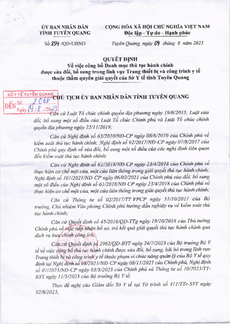 | Tiêu đề văn bản | Quyết định số 854/2023/QĐ-UBND về công bố Danh mục thủ tục hành chính được sửa đổi bổ sung trong lĩnh vực Trang thiết bị và công trình y tế thuộc thẩm quyền giải quyết của Sở Y tế tỉnh Tuyên Quang | ||